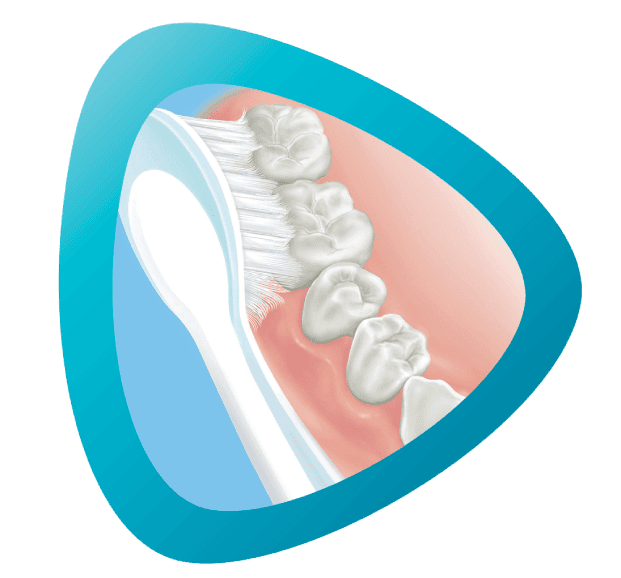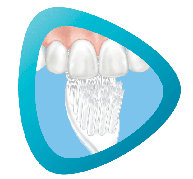 Reinig de buitenoppervlakken van je bovenste tanden en daarna je onderste tandenrijen. Houd de borstel in een hoek van 45° ten opzichte van het tandvlees en poets van het tandvlees af. Reinig elke tand grondig met korte poetsbewegingen.